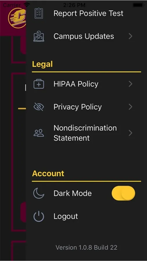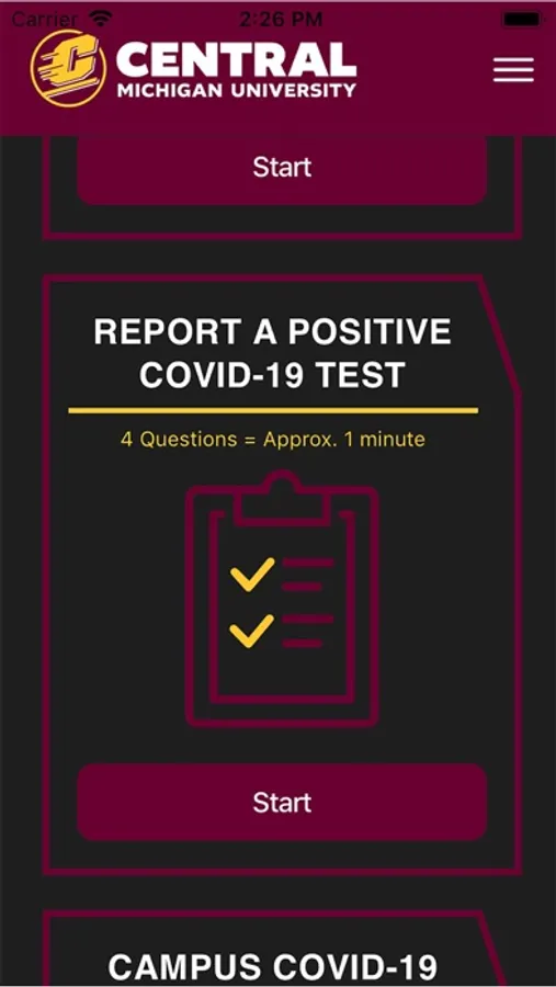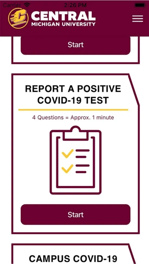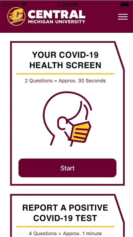 This app is for the students, staff and faculty of Central Michigan University to self screen for COVID-19 before entering CMU's campus.