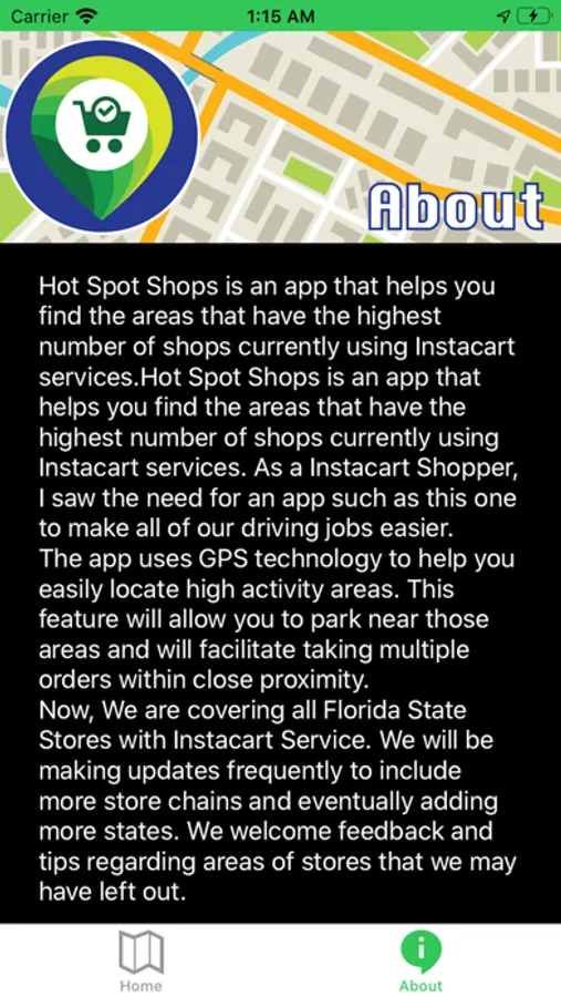 Hot Spot Shops is an app that helps you find the areas that have the highest number of shops currently powered by Instacart services. Hot Spot Shops is an app that helps you find the areas that have the highest number of shops currently using Instacart services. As a Instacart Shopper, I saw the need for an app such as this one to make all of our driving jobs easier.