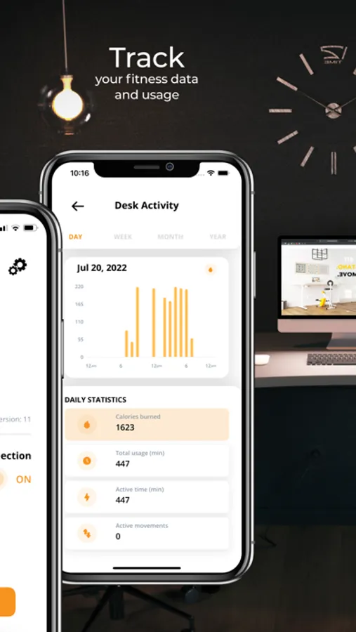 - Track your office stats and daily goals, noting your time sitting, standing, or biking, and collecting achievements for your work along the way