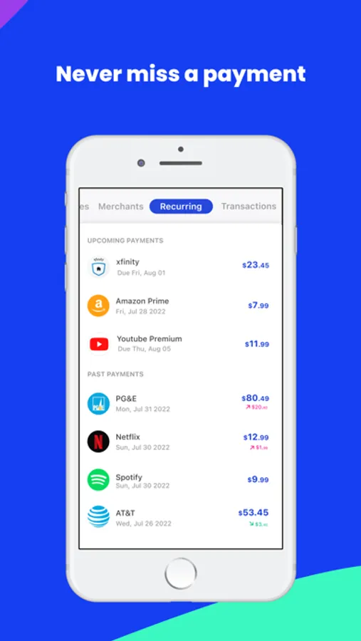 You can view all your recurring payments in one location and also keep track of upcoming payments you have each month.
