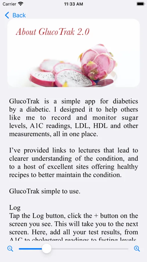 GlucoTrak 2.0 is a simple, straightforward app. Log in your sugar levels, A1C, HDL, LDL readings, weight and other measurements you want to track. Store reports and photos of recipes. Watch videos on dealing with diabetes through exercise and food habits. It's a handy journal on your diabetes journey.