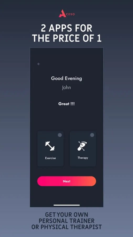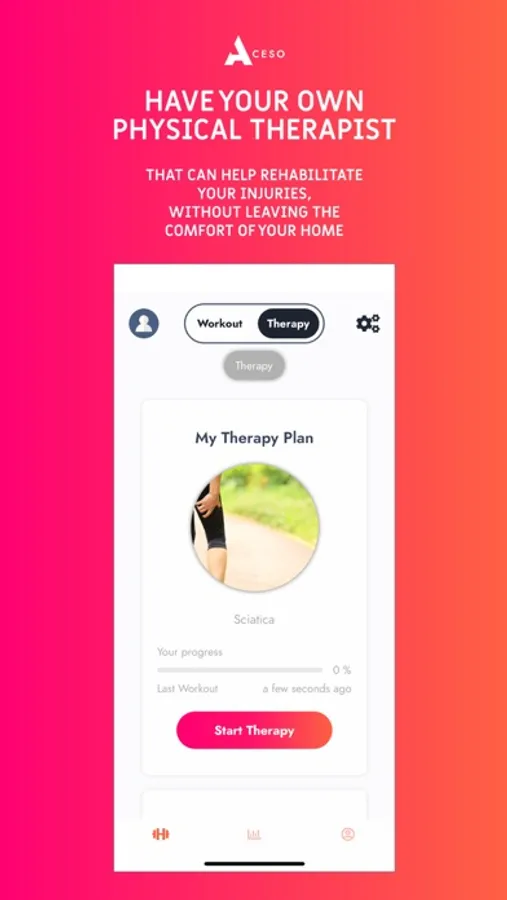Aceso is a mobile app that uses Artificial Intelligence to provide users with a virtual Personal Trainer & Physical Therapist. It will learn their habits, workout ability and adapt. Tailoring each workout/exercise based on the previous ones & the users end goal to challenge them a bit more every time. The Rehabilitation side of the app will create custom Home Exercise Plans that will help users recover from most musculoskeletal disorders, while tracking their progress.