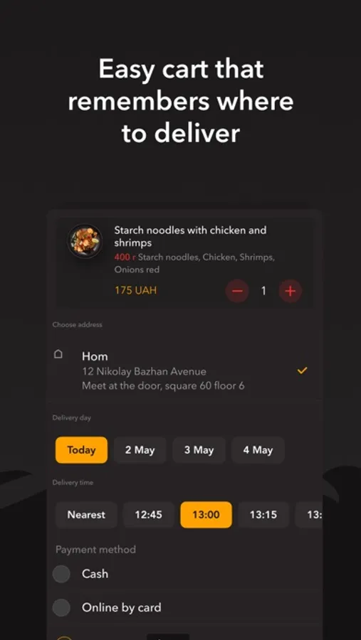 The minimum order amount is 400 UAH. Orders are accepted from 11:00 to 22:45.