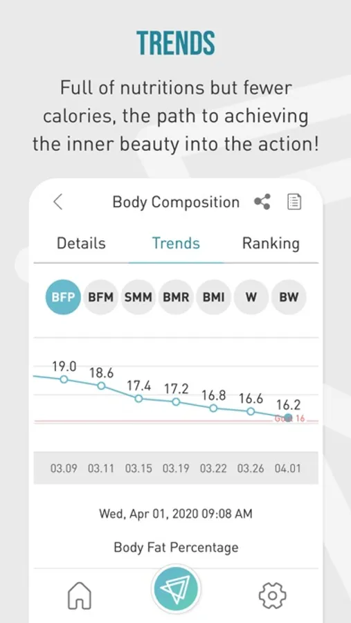 It provides body fat percentage, body fat mass, skeletal muscle mass, basic metabolism, body mass index (BMI), and body water.
