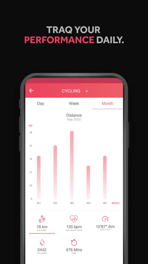With your TRAQ app, you can set daily goals for your training, track them at any moment and outperform your previous score. Living up to the challenges you throw at yourself is a breeze, as the performance charts on the app map out your progress and inspire you to push harder. Compare your daily, weekly, monthly and yearly stats and outperform your only competition - you.