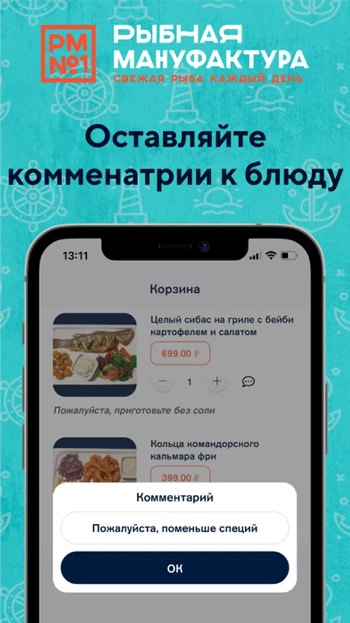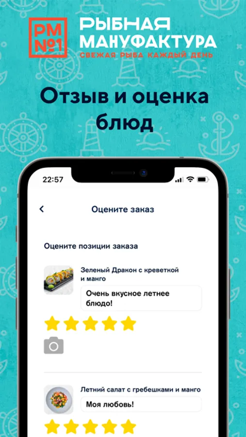 «Рыбная Мануфактура №1» - это уникальная сеть рыбных бистро с демократичными ценами на блюда из рыбы и морепродуктов, домашней атмосферой и внимательным обслуживанием. В нашем приложении вы можете оформить заказ к столику, находясь в ресторане.