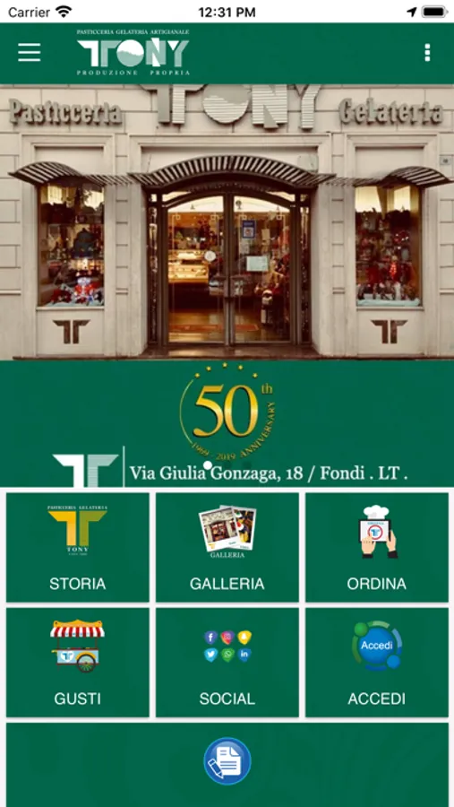 La Pasticceria Gelateria Artigianale Tony, nasce in Fondi (LT) il 28 dicembre 1969, si trova in via Giulia Gonzaga n° 18, in pieno centro, a 2 passi dal Castello Baronale, specializzata nella produzione di pasticceria fresca e secca.