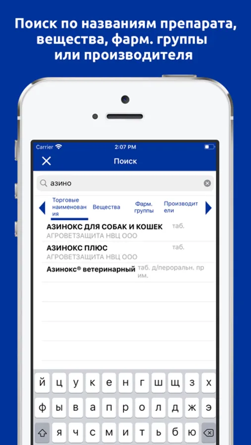 Поиск ветеринарных препаратов по торговым наименованиям, активным веществам, фармацевтическим группам и производителям.