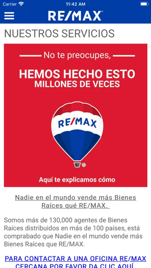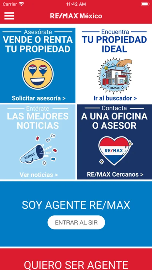 En la aplicación de RE/MAX México podrás conectarte con los asesores de RE/MAX en todo el país para asesorarte en cualquier tema inmobiliario que necesites. Si quieres comprar o rentar una casa, departamento o cualquier tipo de propiedad aquí podrás encontrarla utilizando nuestro buscador de propiedades. Si quieres poner a la venta o renta tu propiedad podrás conectarte con nuestros agentes para que te asesoren en todo el proceso y si eres agente inmobiliario RE/MAX aquí podrás encontrar noticias relevantes, accesar al SIR y mucho más.