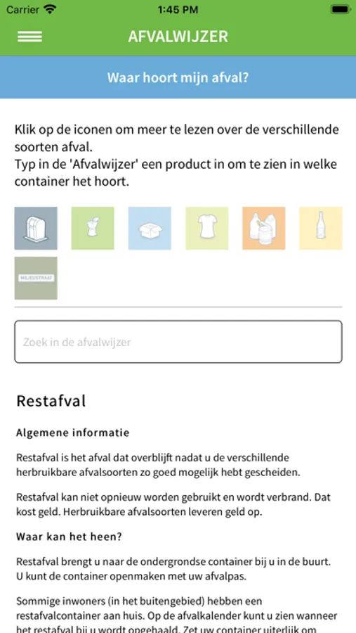 Deze app helpt u herinneren wanneer u uw container aan de straat moet zetten en waar de dichtstbijzijnde glasbak en textielcontainer staan. Ook kunt u meldingen maken over afval en