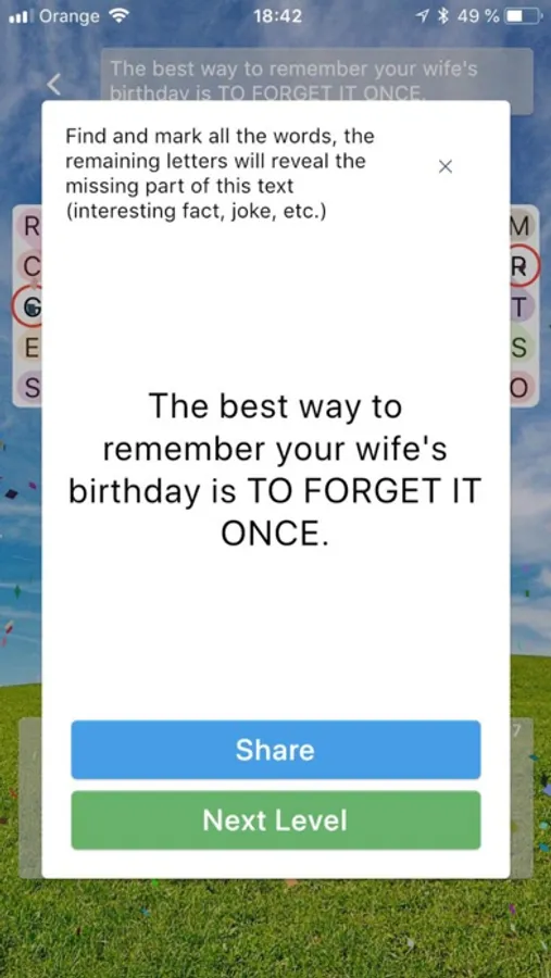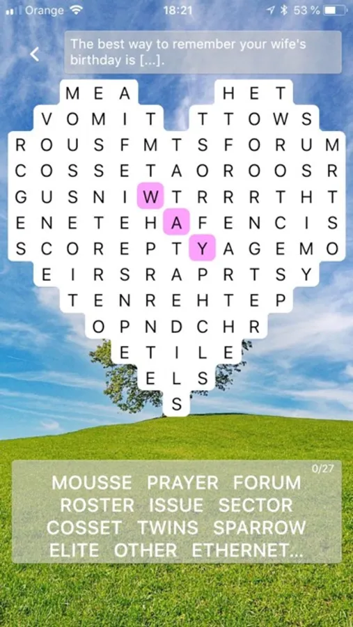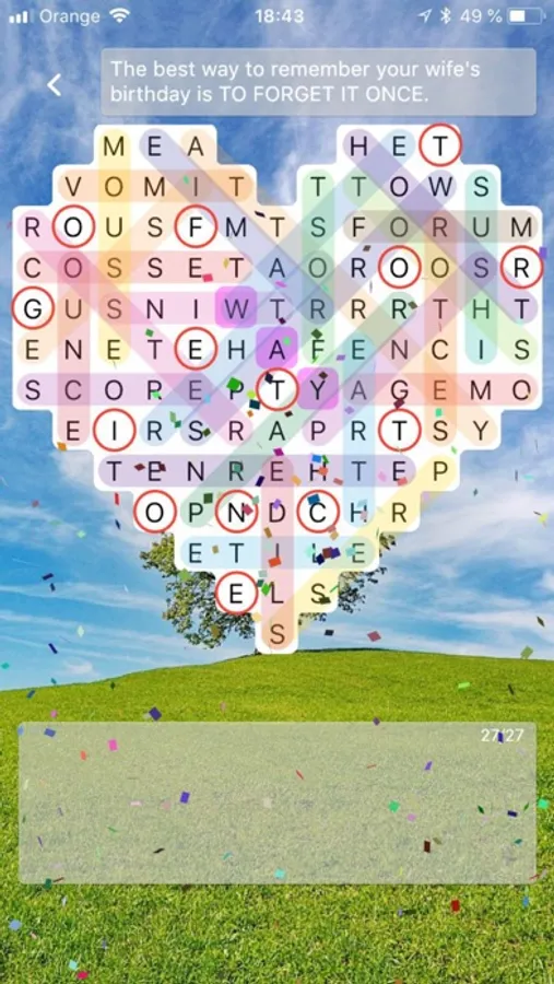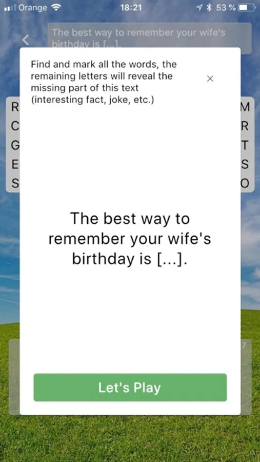 Open puzzle, find and mark all the words from list and the remaining letters will reveal the missing part from task (jokes, interesting facts, celeb rumors, tips for life, famous statements...).