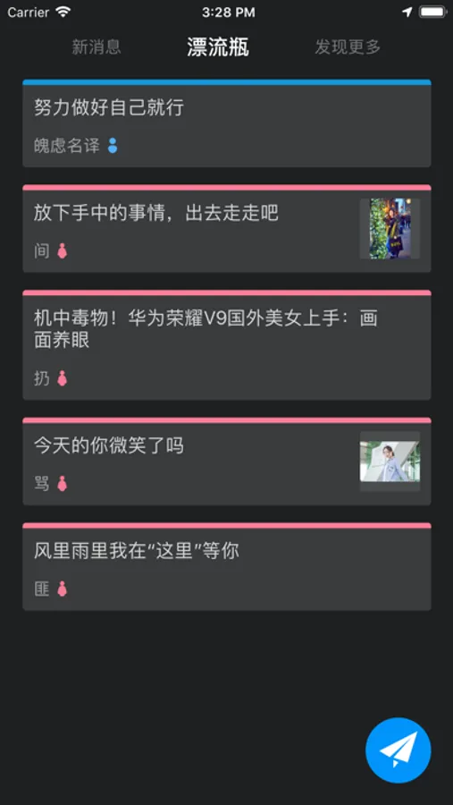 全新简约黑色漂流瓶-陌生人匿名聊天。