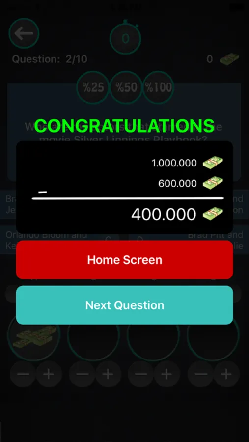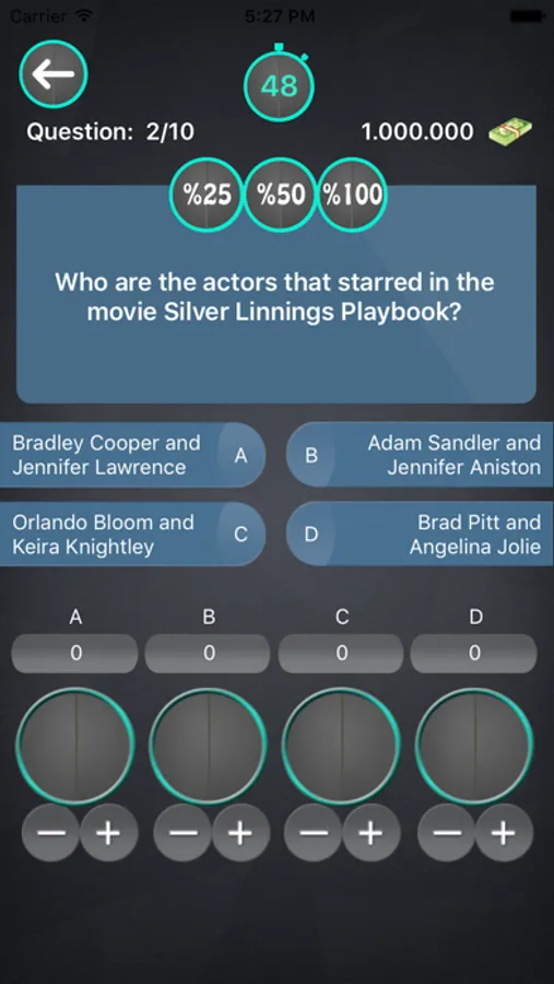 The game consists of 10 questions; It is the aim of the game to protect 1,000,000.