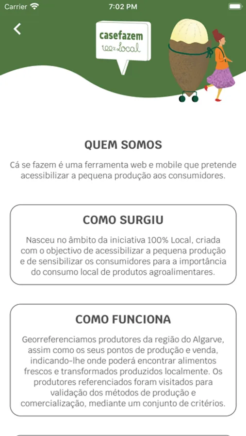 Georreferenciamos produtores da região do Algarve, assim como os seus pontos de produção e venda, indicando-lhe onde poderá encontrar alimentos frescos e transformados produzidos localmente. Os produtores referenciados foram visitados para validação dos métodos de produção e comercialização, mediante um conjunto de critérios.