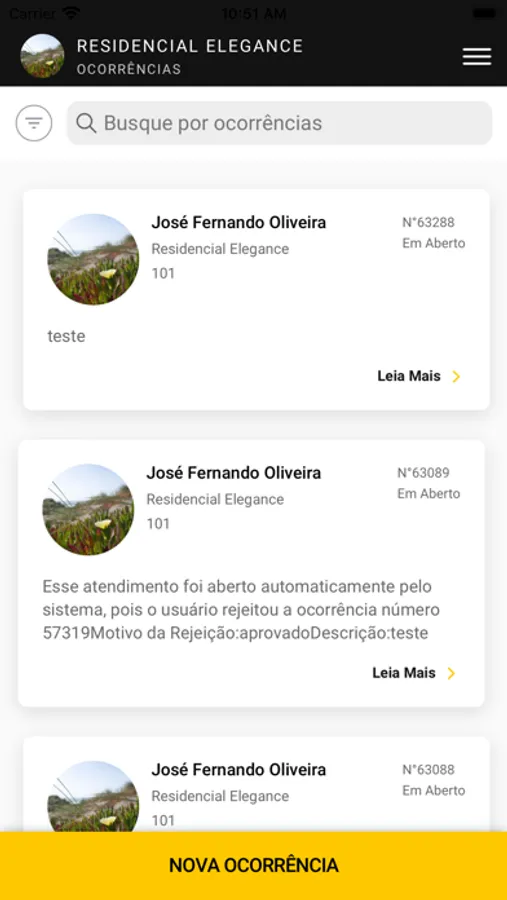Ocorrências aberta por um morador é visualizada somente pelo próprio morador e pelo administrador. Outros moradores não acessam as ocorrências abertas.