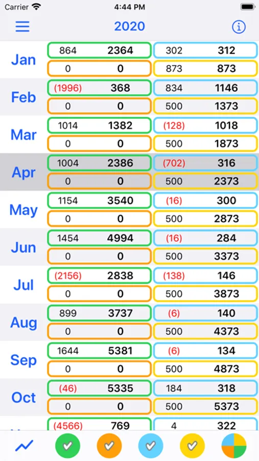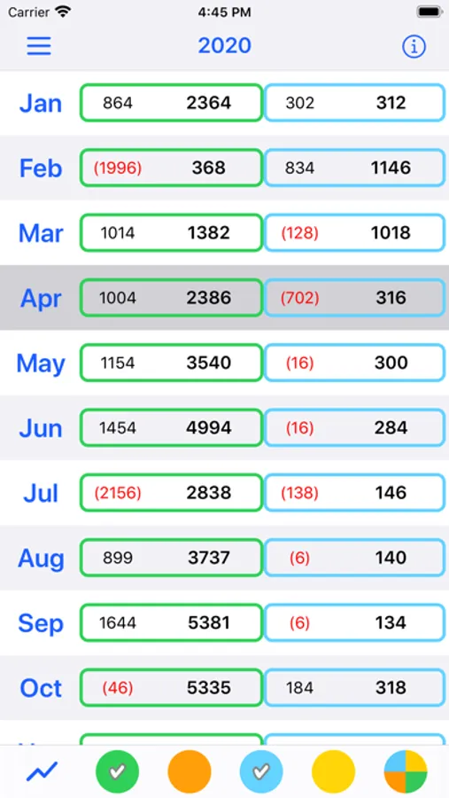 At any time you can view a user selected line chart or a bar chart, that shows you the trend of the accounts both for the whole year or for each month. Accounts are tracked using their colors.