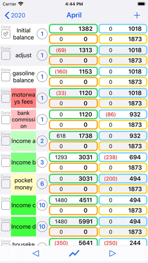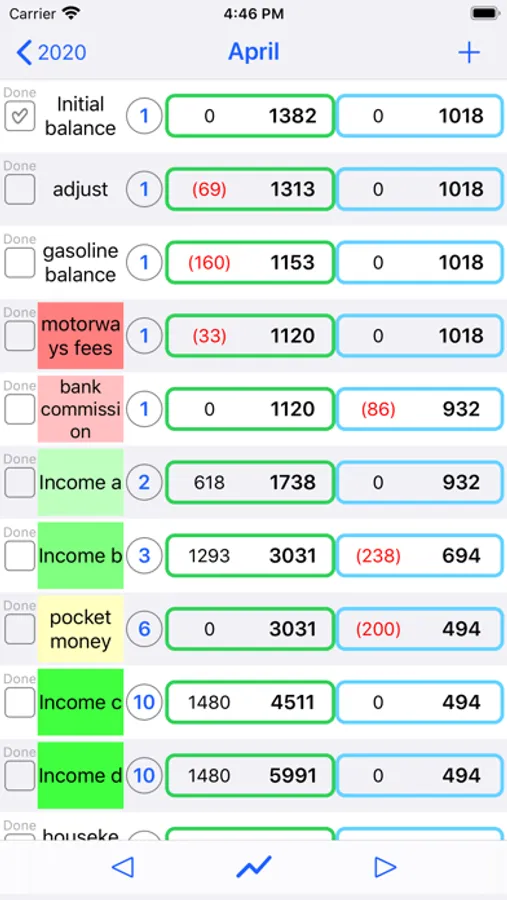 For each transaction you have a description and a date for which you enter movements on the accounts such as uses/costs (-) or sources/revenues (+): transactions already executed can be marked as 'Done'. Foreseen transactions will be left unmarked. By doing so, in the month view, you will have an eye on what has already happened and what you foresee that will happen and when, in the near future.