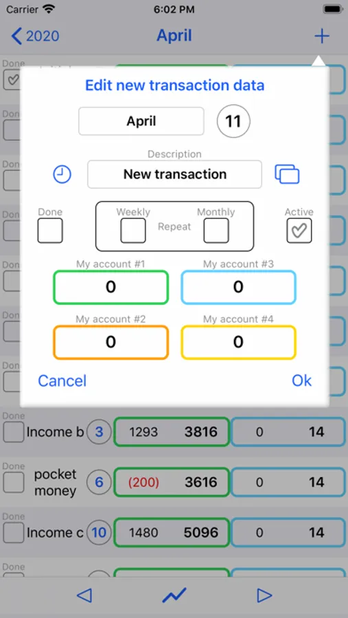 For the first transaction, for example, enter the description 'Initial balance' and the balance on that date of your accounts. By continuing to enter transactions, in each month, you will build your sources-costs budget.