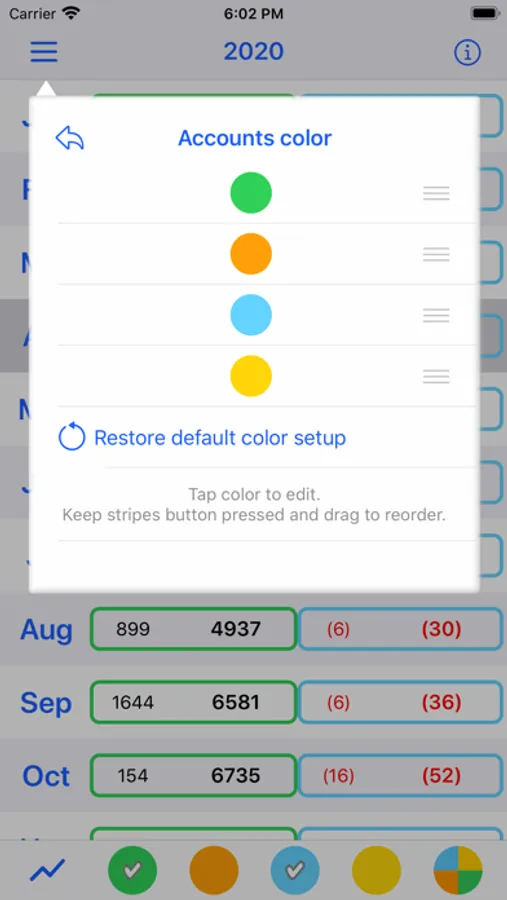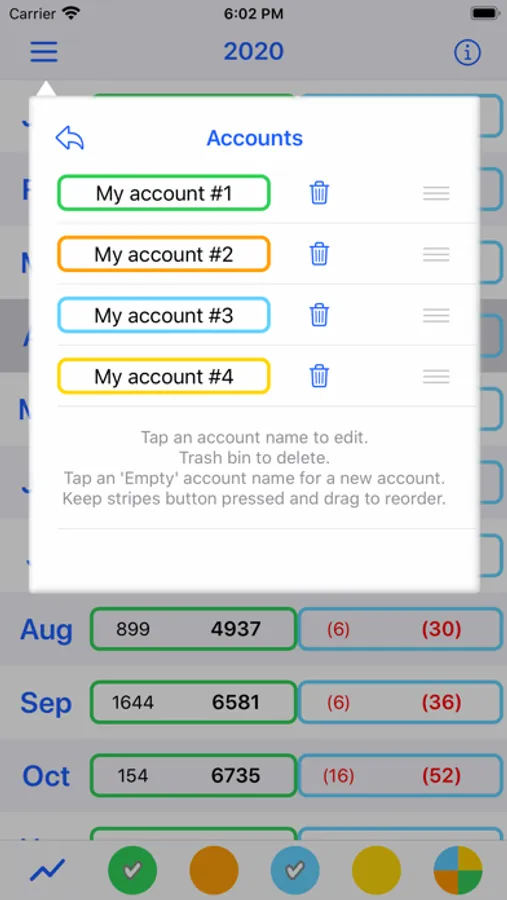 Just out of the startup welcome slides, name your accounts for setup: up to four. You can choose name, color and order.