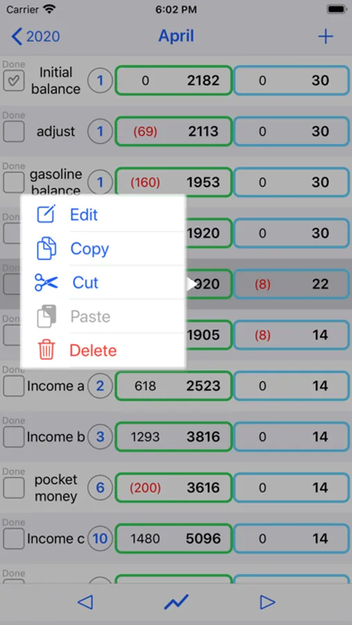 A context menu is also provided for transactions: on the iPhone and iPad, keep the transaction pressed for a few seconds. On Mac, use the right mouse button on the transaction, or use the keyboard [ctrl] key with a mouse click. From the menu that opens you can select the editing form or copy/cut/paste the transaction, or delete it.