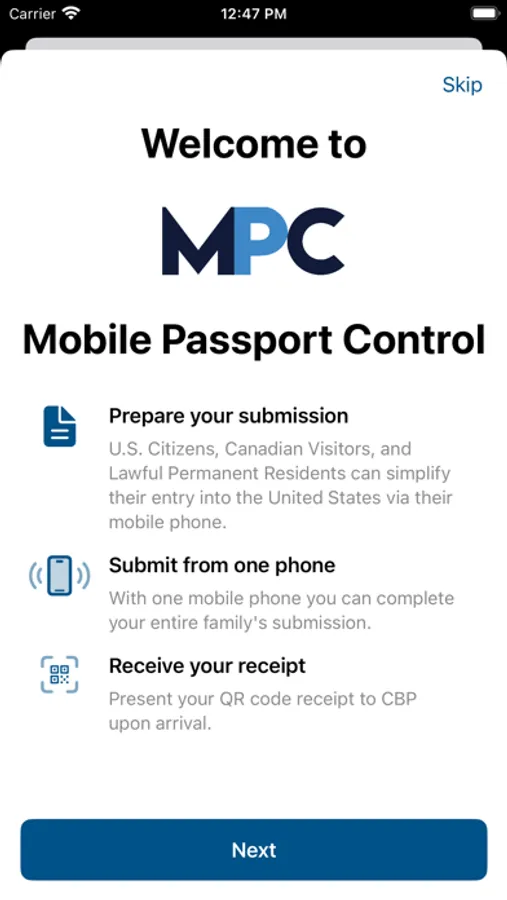 Mobile Passport Control streamlines your U.S. Customs and Border Protection processing experience. Simply fill out your profile and answer CBP’s questions – then go straight to the “Mobile Passport Control” lane at the airport.
