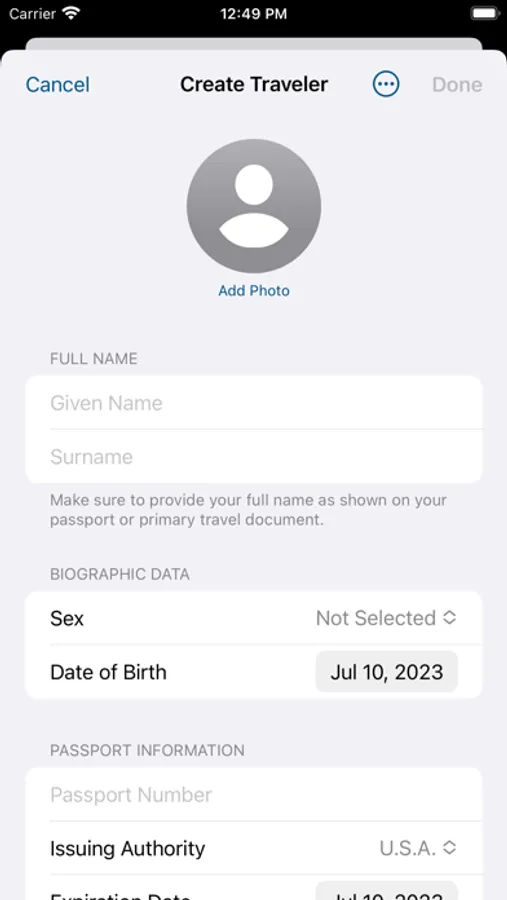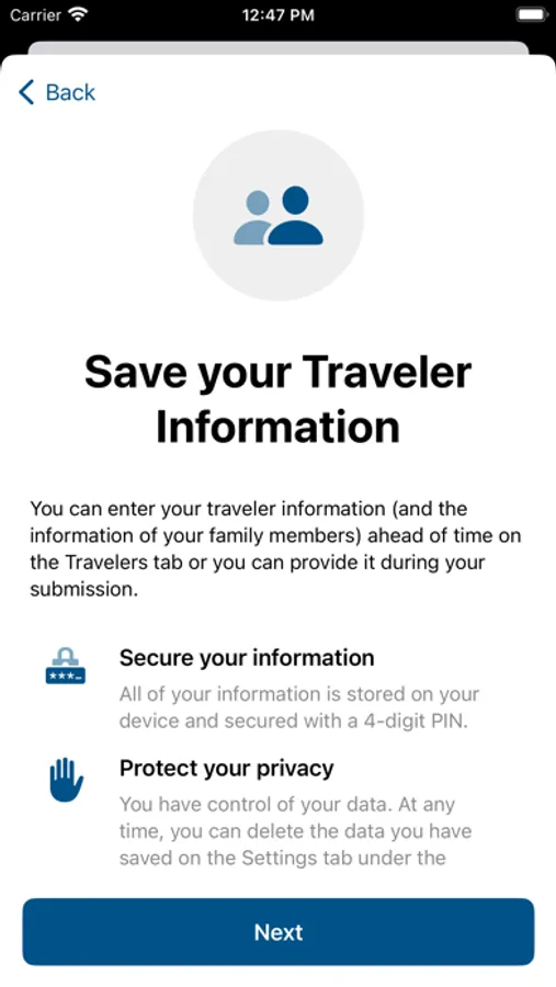 1.) Eligible traveler(s) download the application and create a profile(s) using biographic information from their passport(s) and take a “selfie”; all eligible members in a family group can create a profile, submit their CBP form (up to 12 eligible members per trip), and store their information completely free to be used for future travel.