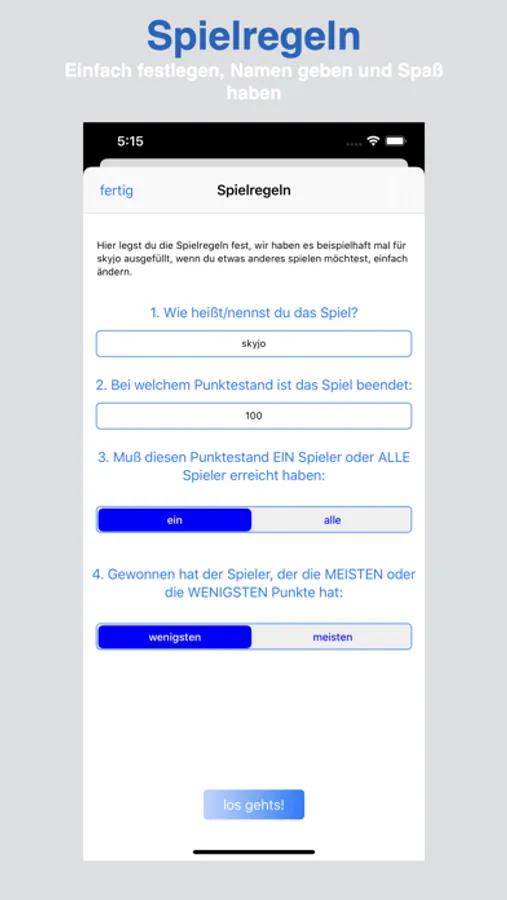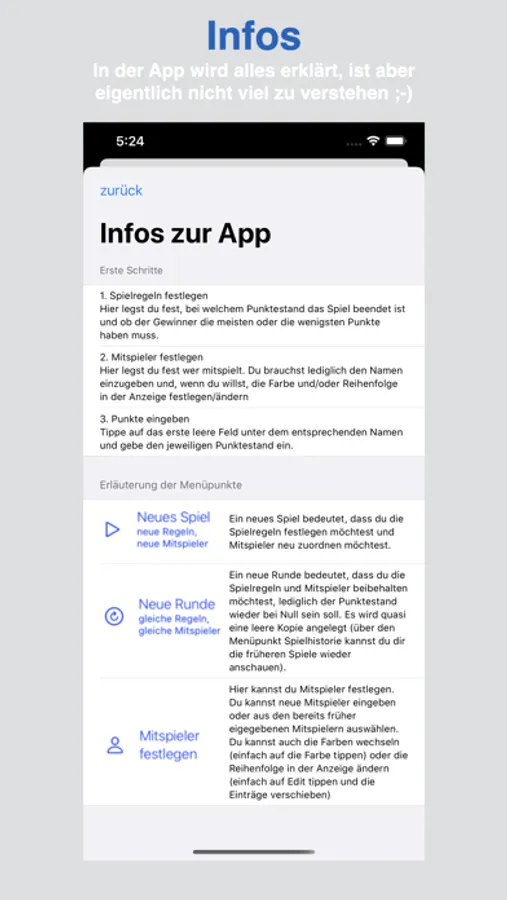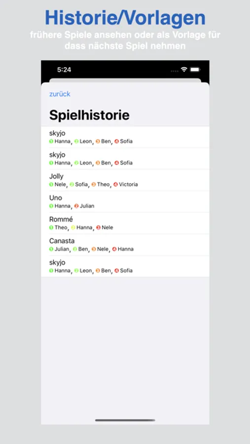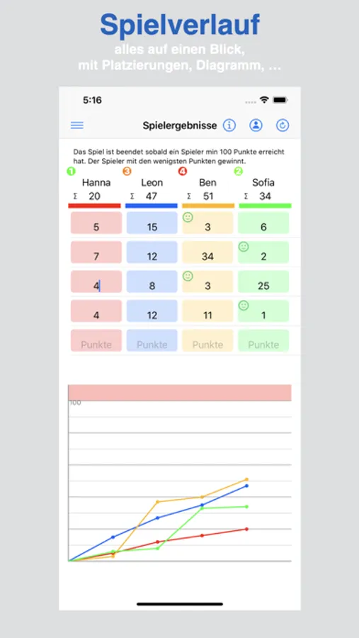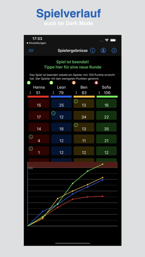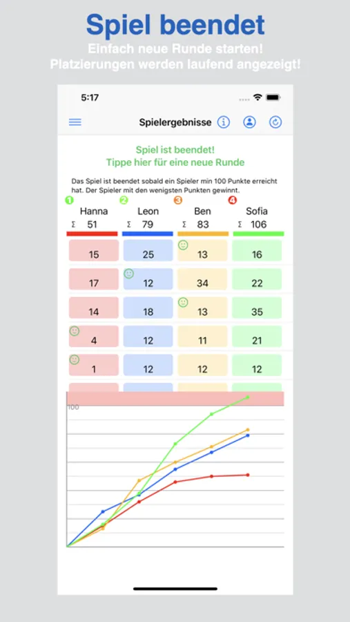 Die App rechnet automatisch aus, wieviele Punkte jeder hat, wer aktuell vorne liegt. Ein Diagramm zeigt übersichtlich den Spielverlauf!