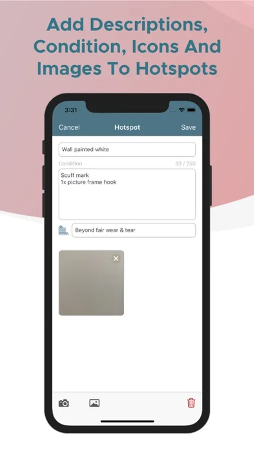 -Hotspots, annotate features in your space that require observation such as description, condition and images. Help guide users to what they need to see