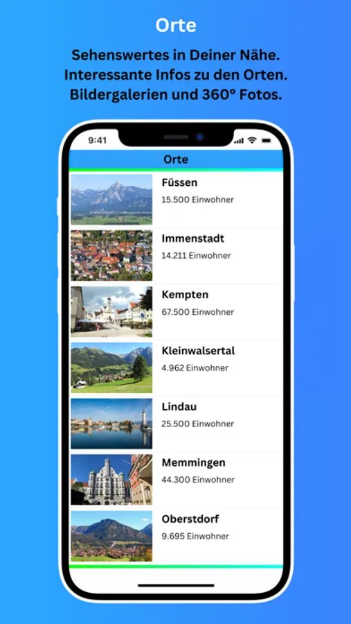 In der App findest Du sowohl die besonders stark besuchten Gemeinden Füssen, Lindau, Oberstdorf, Bad Hindelang, Schwangau und Oberstaufen, die Städte Kaufbeuren, Kempten und Memmingen, das Kleinwalsertal und Jungholz in Österreich, als auch die weniger stark besuchten, aber genauso sehenswerten umliegenden Gemeinden.