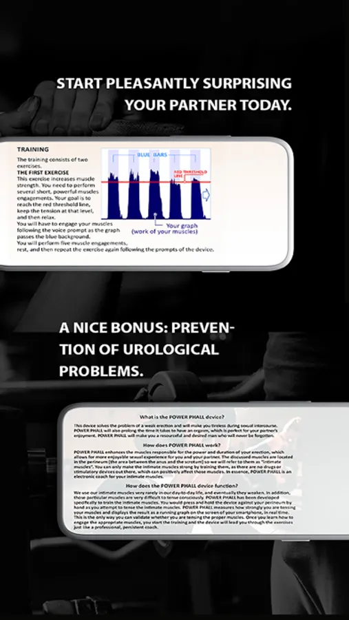 A convenient PowerPhall application with a built-in personal trainer will lead you to your results, changing the load depending on your capabilities. Safe and comfortable use, clear short exercises for watching movies or slides (erotica). Quick result.