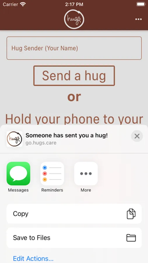 To send a remote hug, enter your name and the name of a loved one and click send. No data will ever be collected about you or the hug receiver by our app.