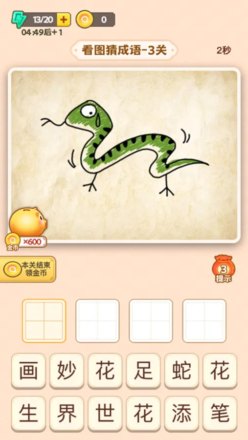 超多成语关卡,在成语的世界里,成为你的王者,复古画风,诙谐有趣的题目,独树一帜的画风,诙谐有趣的题目,用一幅画或几个字来猜一个成语,巧妙的图与字的结合,让你苦思冥想后恍然大悟,开怀一笑!寓教于乐,绝对是老少皆宜的文字游戏佳品!