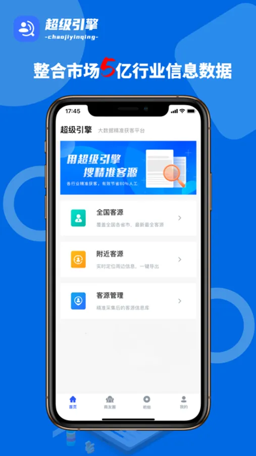 超级引擎主要功能:包括全网采集,附近搜索,同城客源,满足不同行业不同用户的需求,为用户提供更具有价值的的精准客户信息,及时发现商机。