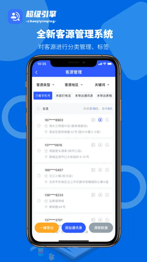 超级引擎所有精准客源数据都是实时更新实时采集,更能满足用户的需求,并可以将数据一键添加至手机通讯录,无论您是业务员、微商,或是厂家、批发商、零售店,只要您需要客户,需要精准客源,超级引擎就能帮您做到,让您的业务范围遍布全国,实现业绩快速增长。