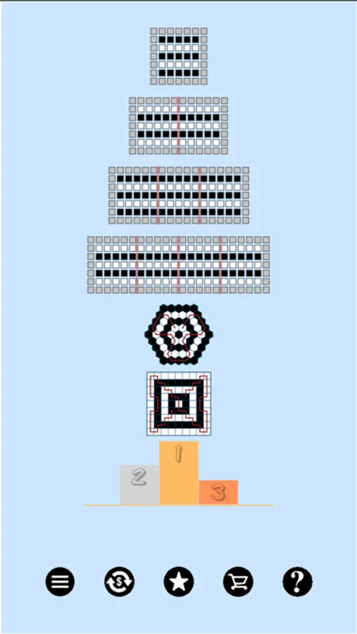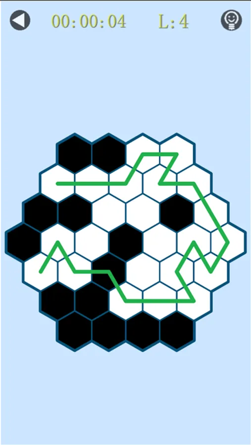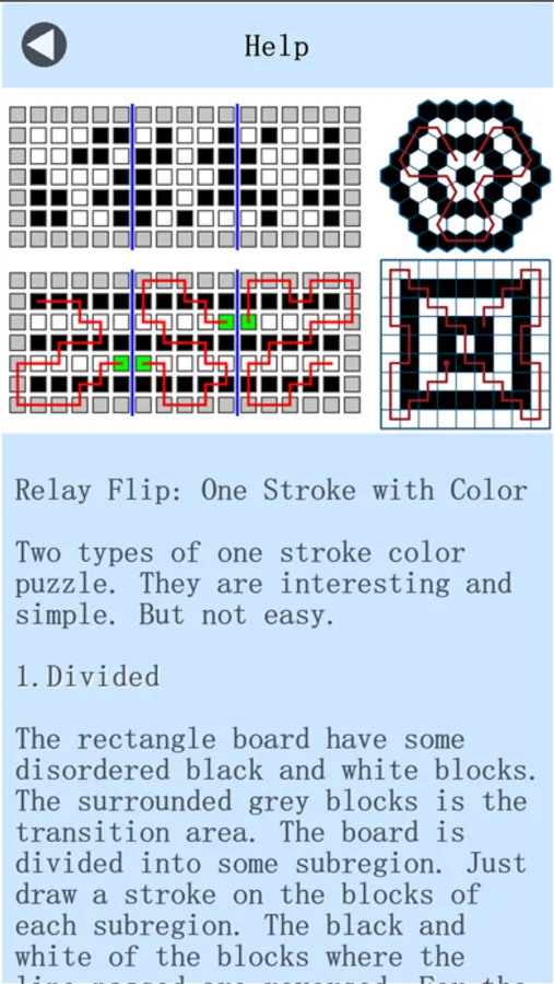 Including hexagon and square two kinds of board. There are some disordered black and white blocks on it. Draw a stroke from any position on the board, and the color of the block that the line passes through is reversed. When the color of each circle from the center outward is same (black or white) . The puzzle is solved.