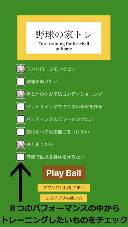 「野球の家トレ」は、野球に必要なパフォーマンス別に、あなたが選んだ目的に合わせて、家や公園でもできる基礎体幹トレーニングメニューを作成してくれるアプリです。