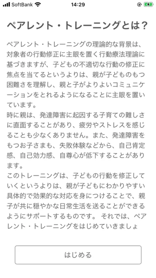 本アプリケーションは、育児をされている方のメンタルヘルスやお子様の発達等に対して、ペアレント・トレーニングがどのような効果をもたらすかを検証することを目的に作成された学術用アプリケーションです(個人向けアプリケーションではありません)。