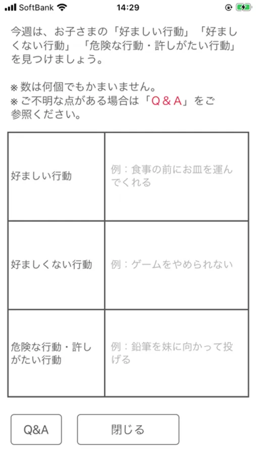本アプリケーションでは、ペアレント・トレーニングを実践するための方法やペアレント・トレーニングに関するQ&Aなどを閲覧することができます。また、日々のトレーニングの達成度を記録することができます。