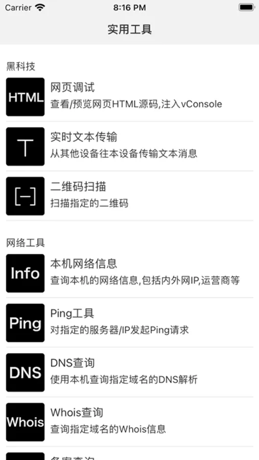 局域网文本传输、前端调试、JS注入、二维码扫描、Ping,DNS解析,路由追踪,系统字体查看,网络信息查看,二维码生成,网页调试,注入vConsole,JSON格式化等等