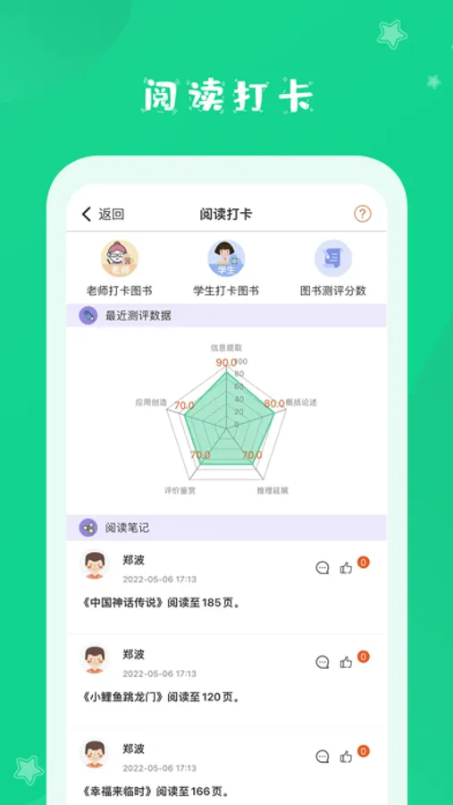 培养学生的阅读兴趣和阅读习惯,通过跟踪和管理学生阅读轨迹,为每一位学生提供专业的阅读数据报告,蜜蜂阅读学生端以接收阅读任务,阅读打卡、结果评测,阅读激励四大功能为主,同时通过多样化的打卡、分享、点赞、交流等方式提升阅读兴趣,专业的分级书库可以让学生挑选符合自己阅读能力的图书。