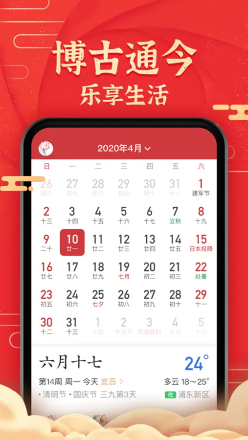 博古万年历,以中华文化为根基,提供便捷公历、农历日期、重要节假日、二十四节气、调班调休查询等功能。简单、便捷易操作,承载传统与多元文化内涵,是您生活中不可或缺的贴心助手。