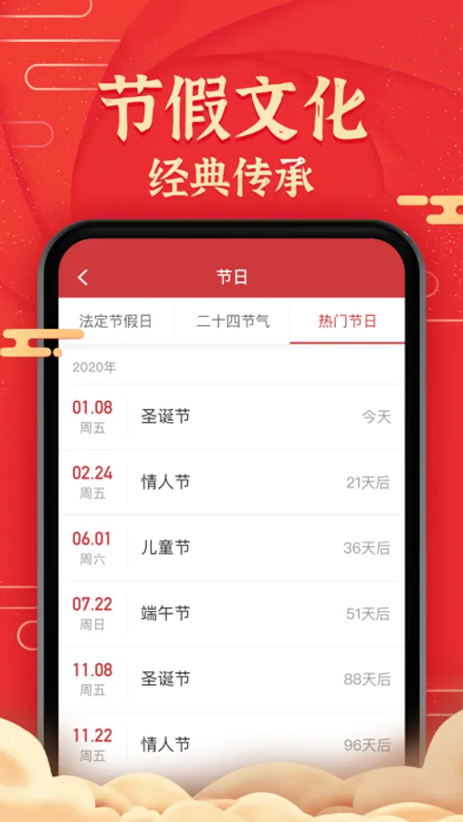 2、节日和节气:国内外热门传统节日和二十四节气日期标注提醒,还有国家法定节假日与上班时间调整注明,更有详细的节日科普介绍,了解多元文化。