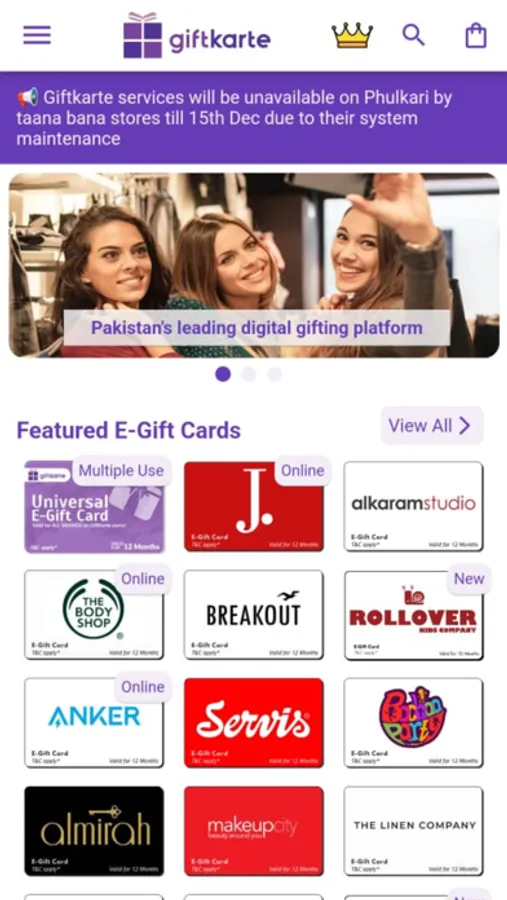 GiftKarte is Pakistan's first of its kind, online mall for eGift Cards. Our platform makes the process of gifting your loved ones a lot more fun, convenient and hassle-free, right from the comfort of your homes. Download the GiftKarte mobile app on your smartphones now for free and enjoy experience joyful gifting through our wide assortment of various retail categories. For all celebratory occasions whether you’re looking for a truly special gift for upcoming anniversaries, birthdays, engagements, Eid, Valentines, Mother’s/ Father’s Day or simply to put a smile on a loved one’s face; use the GiftKarte app to shop for your eGift Card with the few clicks of a button- anytime, anywhere!