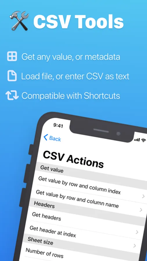 CSV Tools is compatible with the Shortcut app, thus you can integrate it into any automated workflow. Shortcuts integration is a premium feature requiring an in-app purchase.