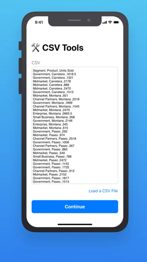 Work easily with CSV files! Enter CSV directly as a text, or load a file from the Files app.