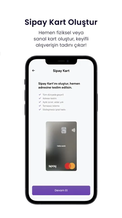You can create a physical or virtual card with the Sipay application, and you can shop freely and securely anywhere in the world with our Visa and Mastercard logo cards.