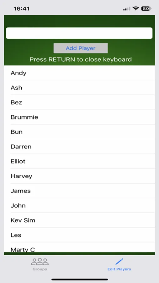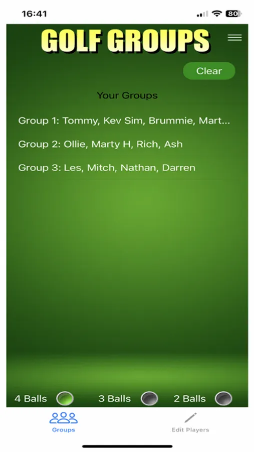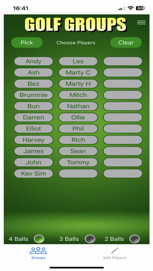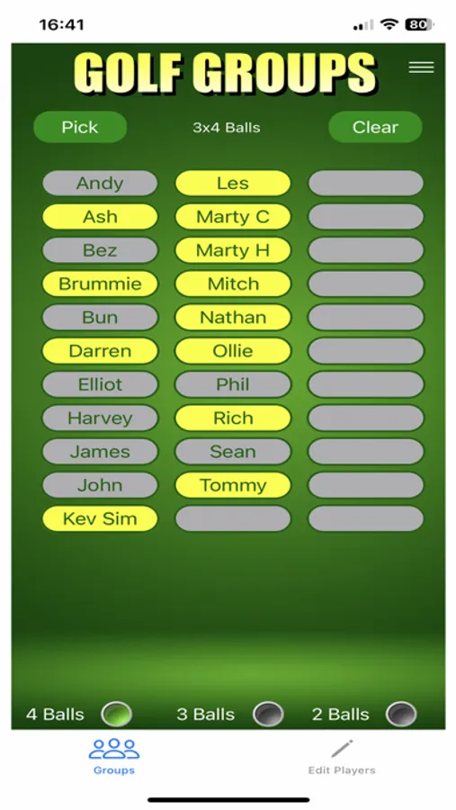 Add your players (up to 33) to the app. Then as they arrive select their name, then when all players are selected, choose to optimise for 2,3, or 4 ball groups and press the pick button. Moments later you have your chosen groups.
