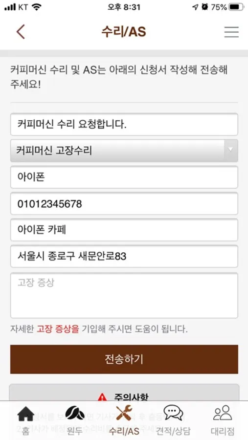 커피머신119 앱 사용 중 오류 또는 문제가 발생한 경우, 오류신고를 해 주시거나 앱 내 문의하기 또는 커피머신119 고객센터를 통해 문의를 남겨 주세요.