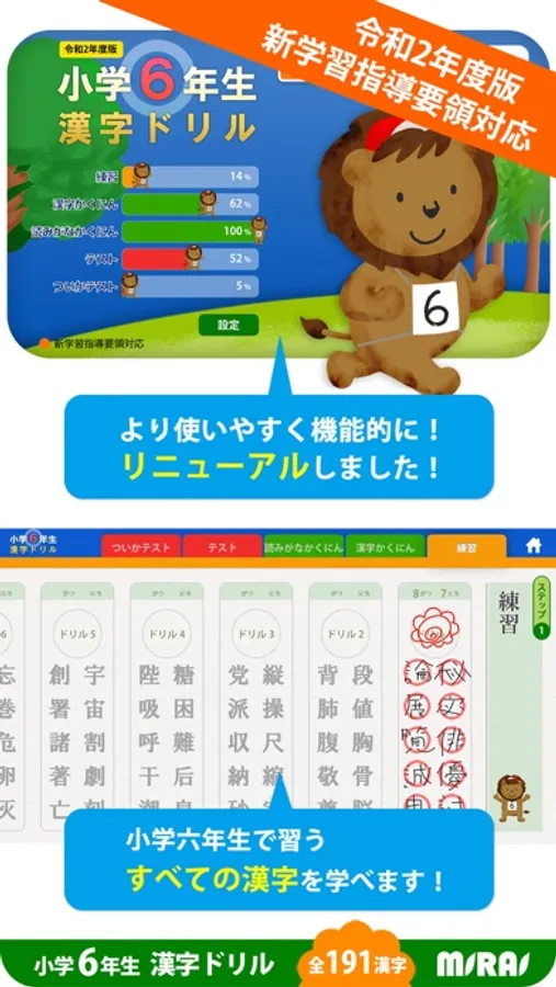 In accordance with the 2020 revised elementary school curriculum guidelines, this app covers 191 kanji learned in the sixth grade of elementary school.