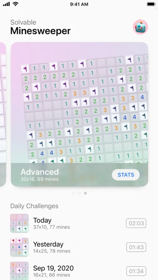 Every board is solvable, but not every board is easy. That's why we added a hint system that uses the power of the Minesweeper AI to show you exactly which part of the board is solvable next.